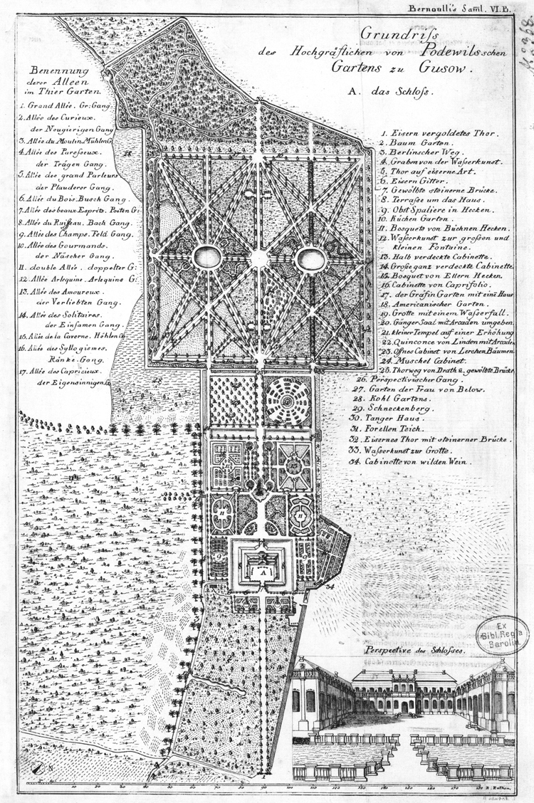 13 Überliefert ist die Lage des ausgedehnten Küchengartens nordöstlich des Schlosses allerdings erst auf einem Plan von 1779 (Wendland & Wendland 2015, Bd. III, Gusow, Abb. 1).