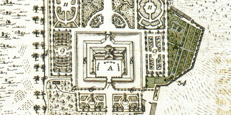 Detail des Gusower Gartenplans von 1782, im Küchengarten (10) östlich des Schlosses (A) könnten Kartoffeln ihren Platz gefunden haben, zu erkennen sind im Süden des östlichen Obstquartiers (9) auch zwei kleine zum experimentellen Anbau geeignete Ackerflächen
