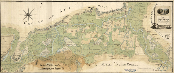 Im Oderbruch entstanden nach der Trockenlegung 1753 erst nach und nach größere Äcker (helle Flächen), die Böden waren schwer und nass, "Carte des Oderbruchs", 1799 (GStPK)